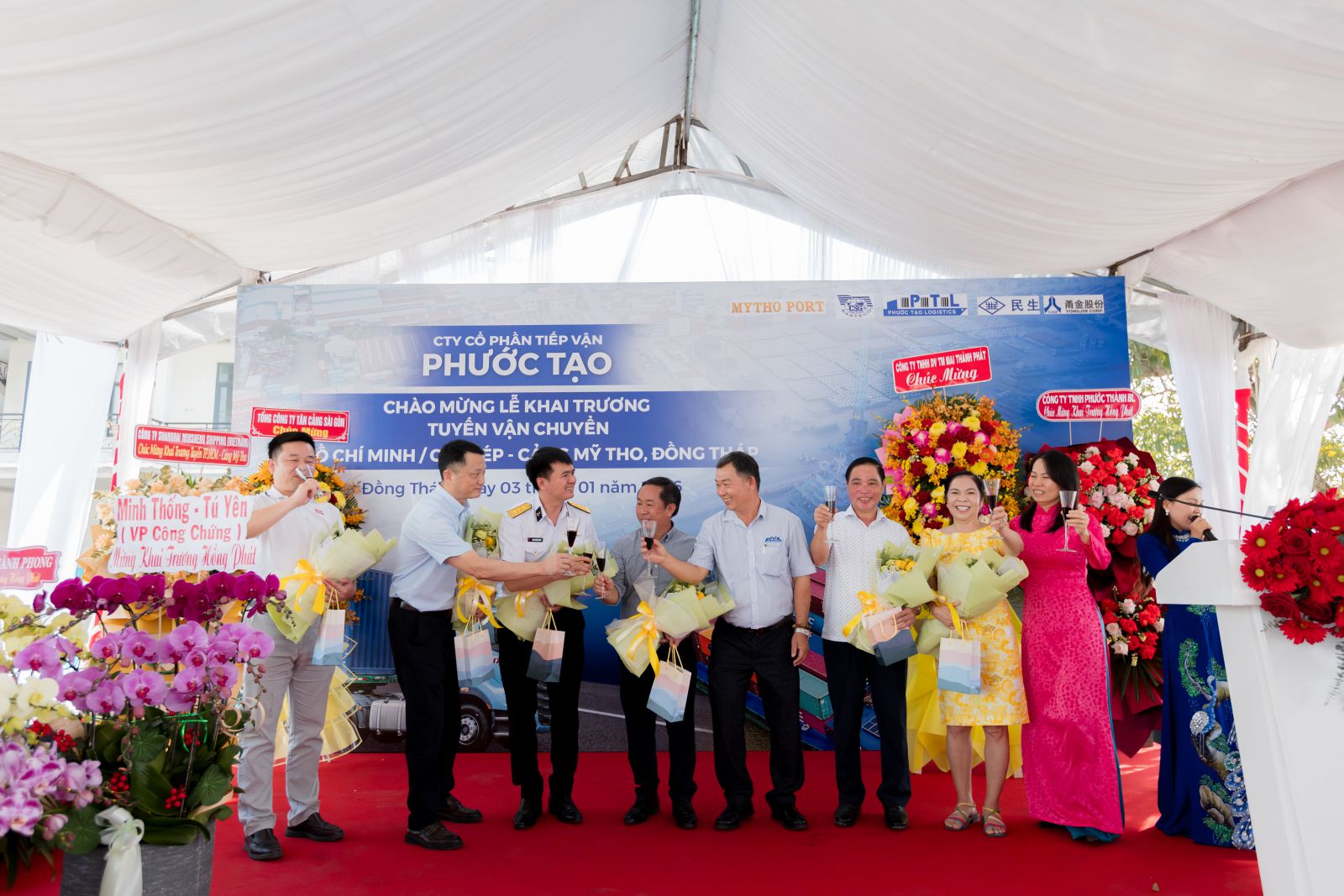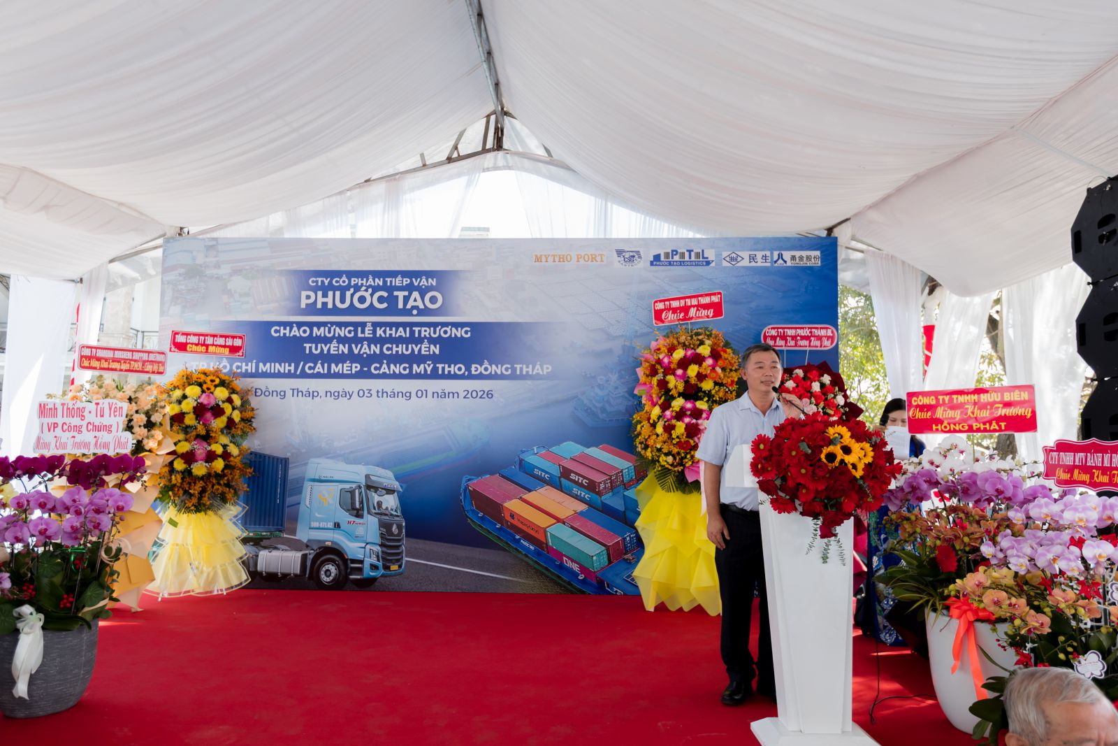 Diễn ra vào sáng ngày 03/01/2026 tại Cảng Mỹ Tho, Công ty Cổ Phần Tiếp Vận Phước Tạo trang trọng tổ chức lễ khai trương tuyến vận chuyển mới: TP. Hồ Chí Minh / Cái Mép đi Cảng Mỹ Tho, tỉnh Đồng Tháp - đánh dấu bước phát triển tiếp theo trong chiến lược mở rộng mạng lưới vận tải và nâng cao năng lực cung ứng dịch vụ logistics khu vực phía Nam.
